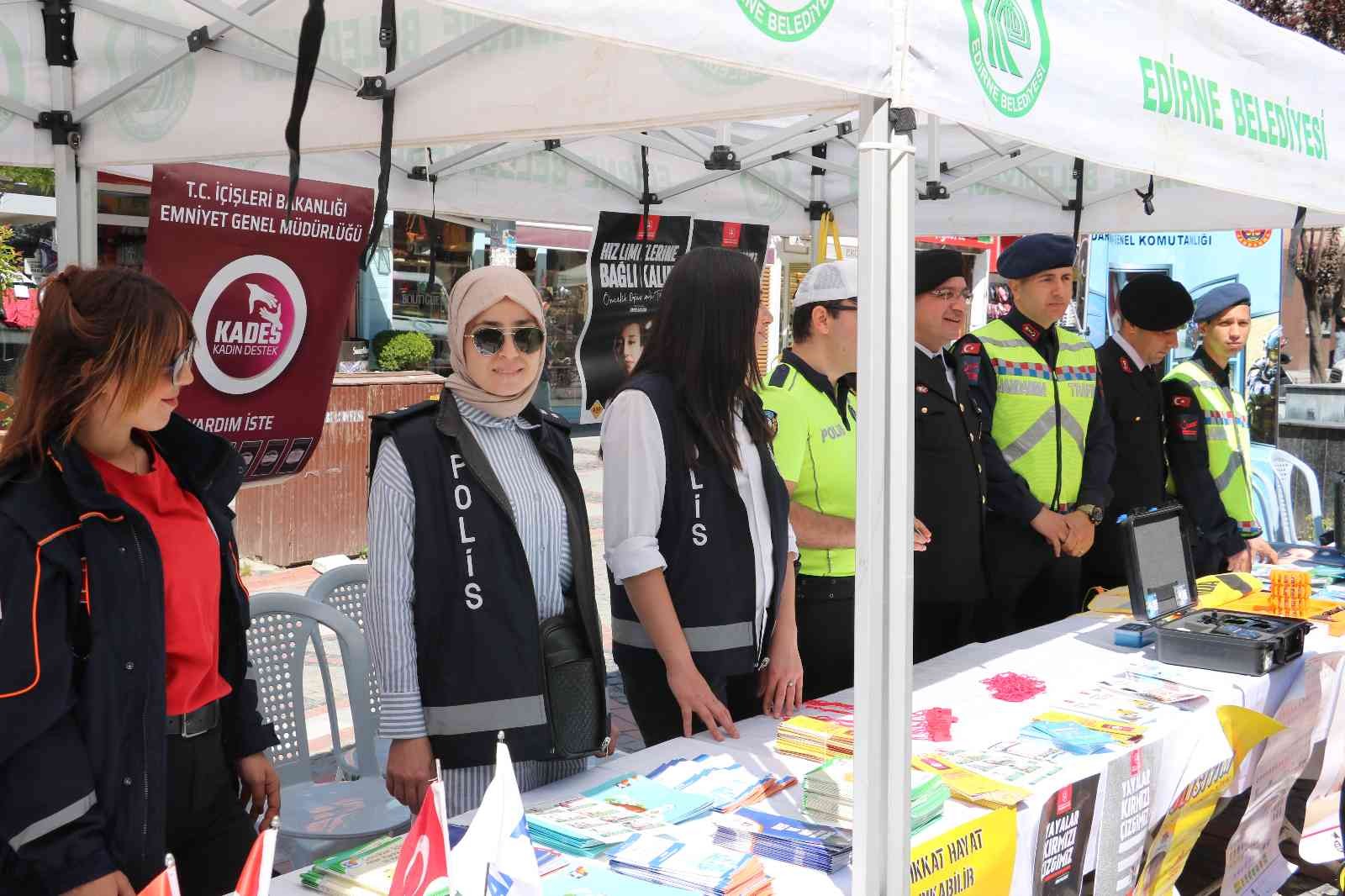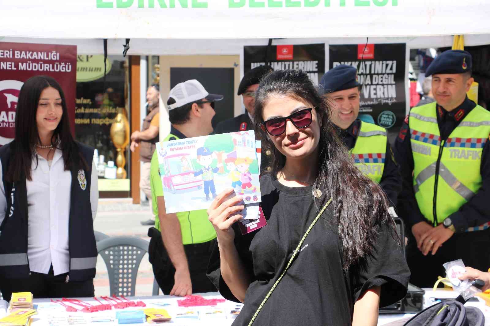 Karayolu ve Trafik Güvenliği Haftası nedeniyle Edirne’nin en işlek noktalarından olan Saraçlar Caddesi’nde İl Emniyet Müdürlüğü, İl Jandarma Komutanlığı, AFAD İl Müdürlüğü ekipleri tarafından vatandaşları bilinçlendirme amaçlı trafik stantları kuruldu.