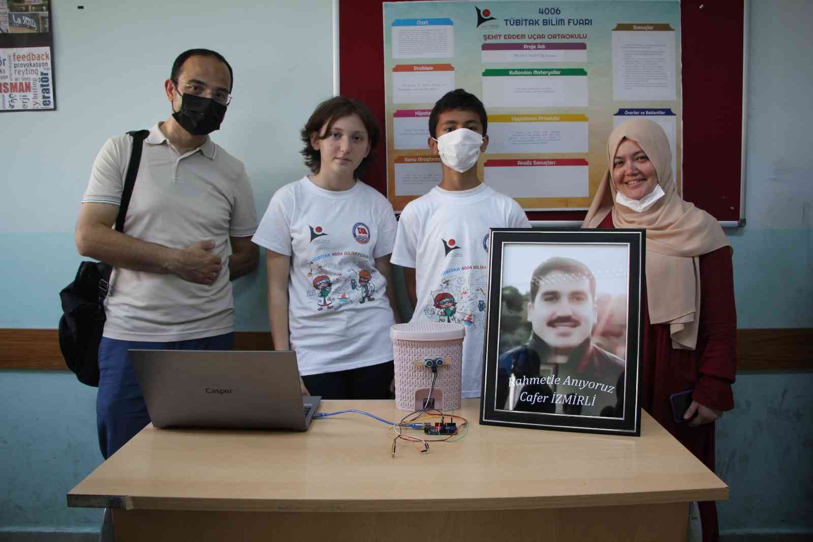 Mesafeli Akıllı Çöp Kovası adını taşıyan projede vatandaşlar hiç temas etmeden açılıp kapanan sensörle birlikte çöplerini rahatlıkla çöp kutusuna atabiliyor. TUBİTAK 4006 Bilim Şenliği çerçevesinde görücüye çıkarılan proje veliler ve öğrenciler tarafından da ilgiyle takip edildi.