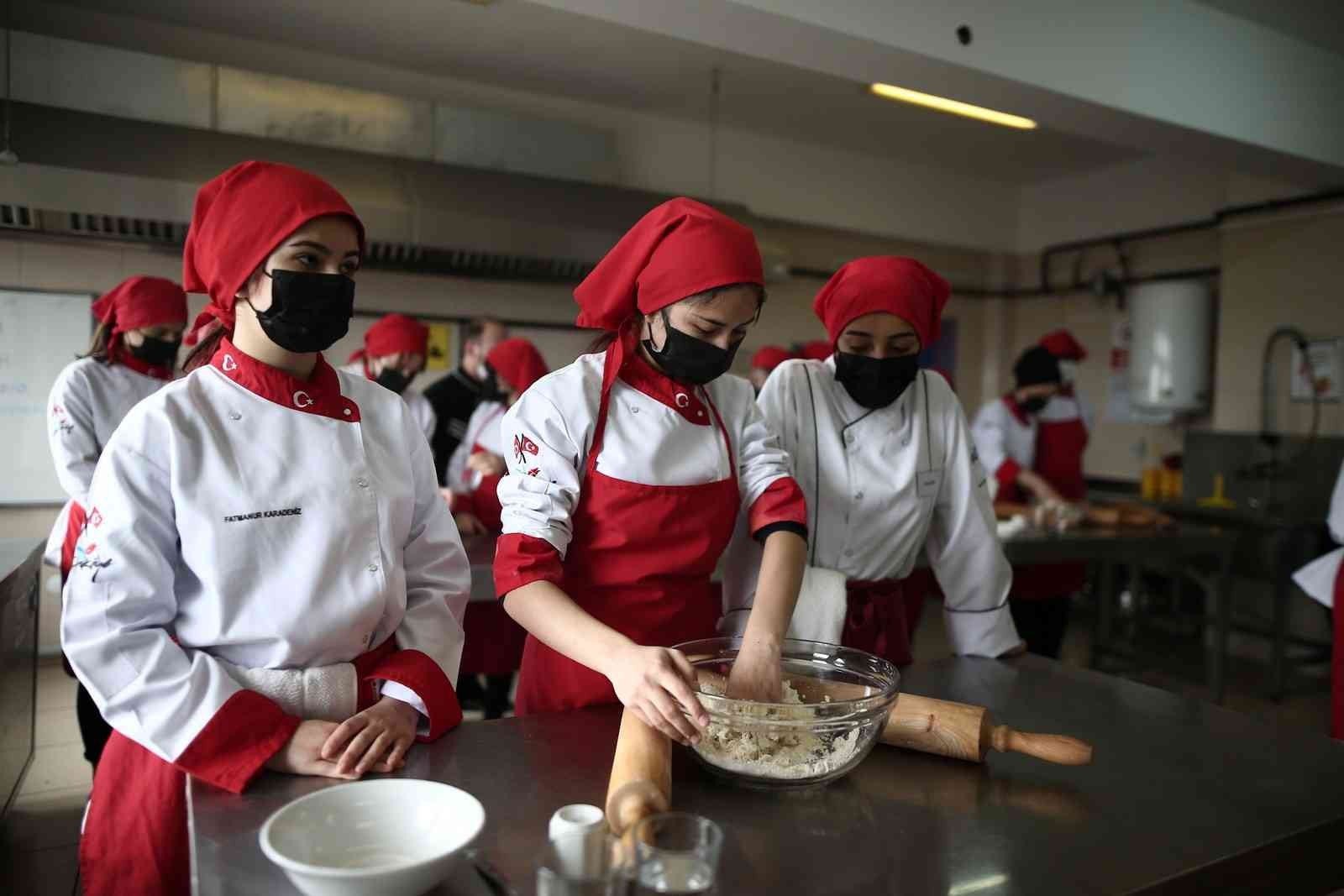 Bir baklava firması ile tamamı kız öğrencilerin eğitim gördüğü okul arasında yapılan protokol çerçevesinde kadın baklava ustalarının sayısının arttırılması hedefleniyor. 10’uncu sınıf öğrencileri, uygulamalı eğitim aldıkları sınıfta baklava ustaları İmdat Tekin ve Arif Aslan tarafından baklavanın püf noktalarını öğrendiler.