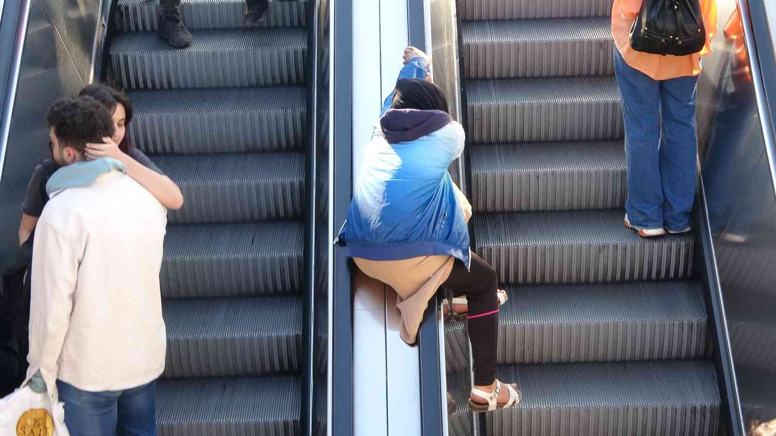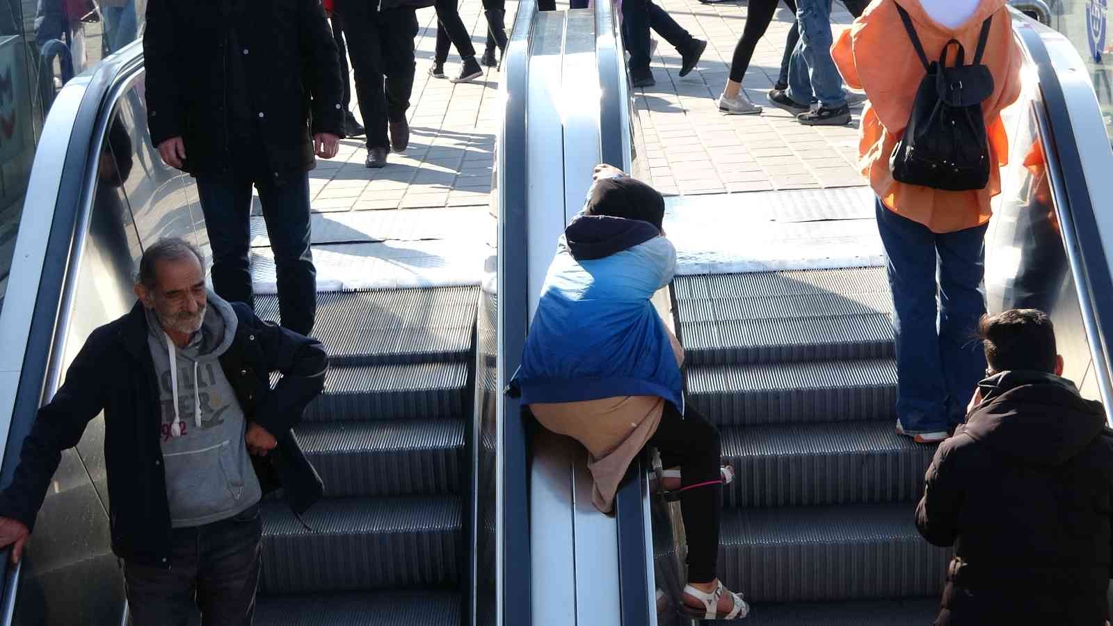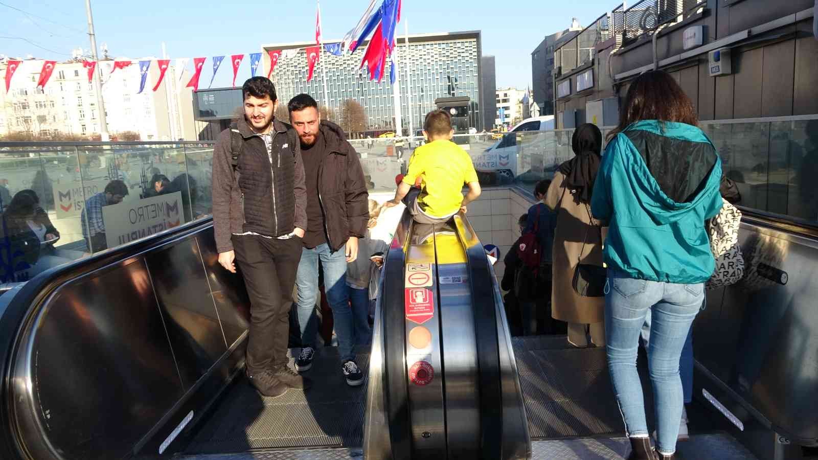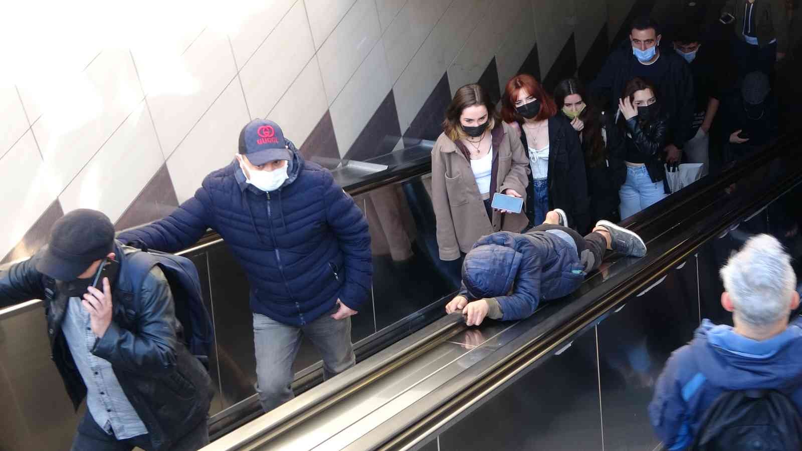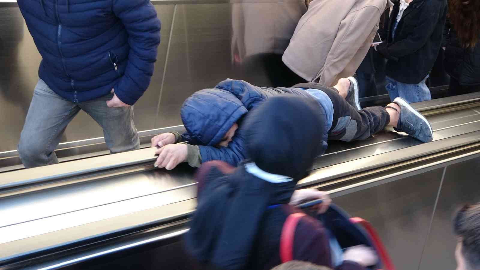 Taksim metrosunun yürüyen merdivenlerinin bandından kayarak eğlenmeye çalışan çocukların tehlikeli oyunu kameraya yansıdı.