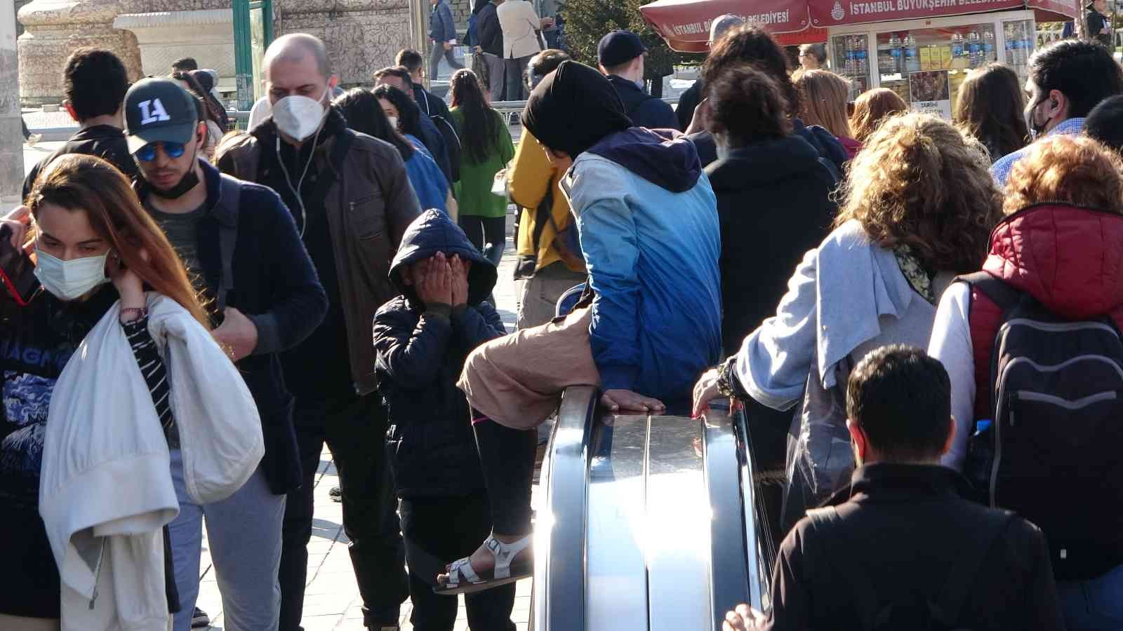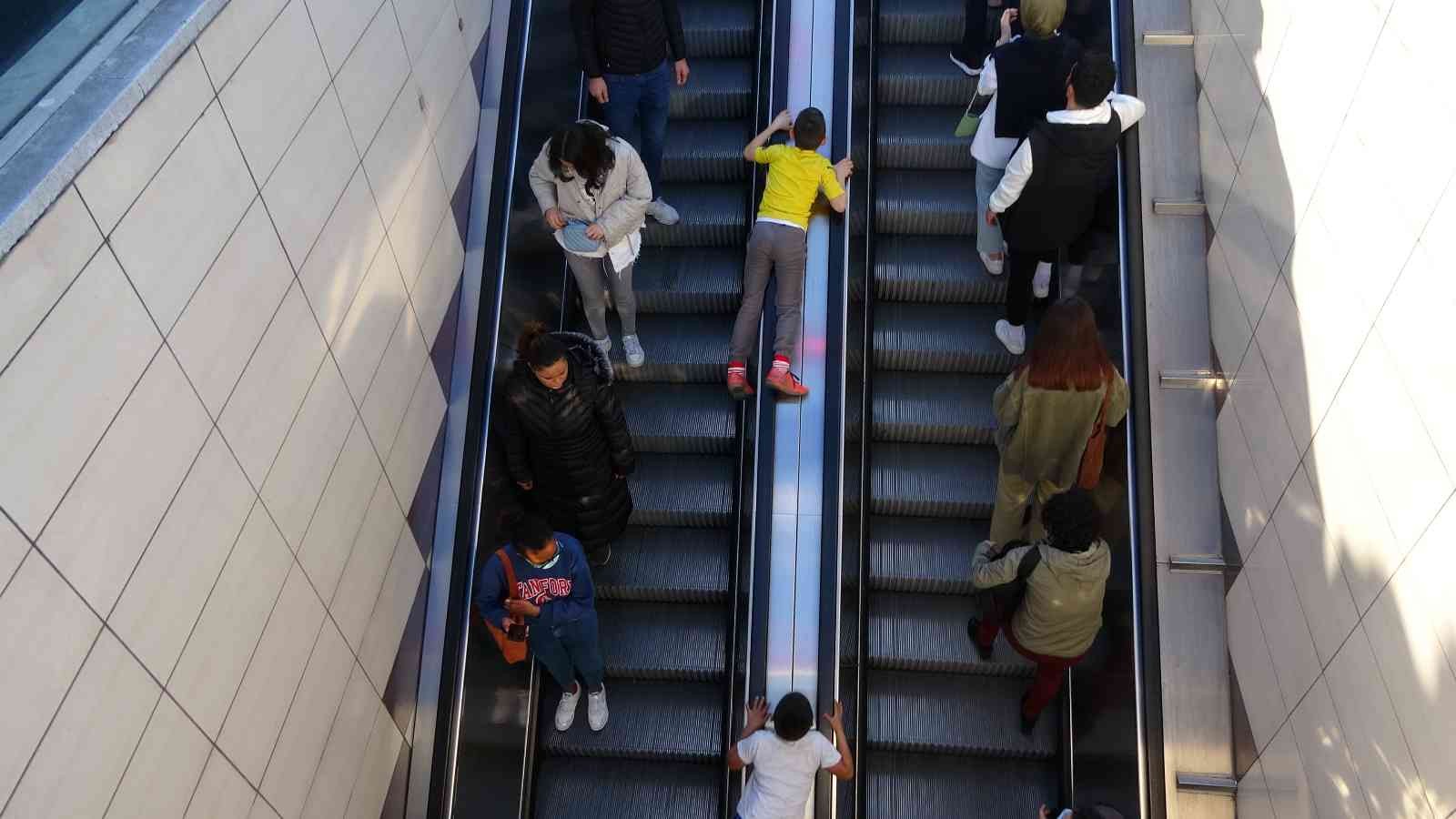 Taksim metrosunda küçük çocuklar eğlenmek amacıyla yürüyen merdivenlerin bandından aşağıya kaydı.