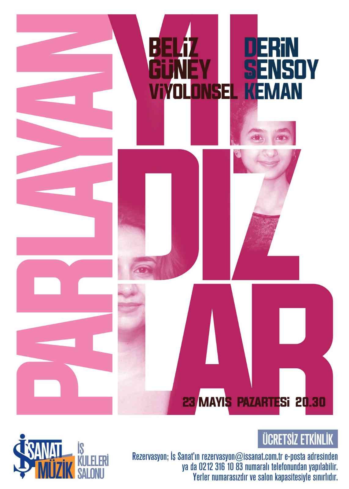 İş Sanat’ın genç müzisyenlere sahne deneyimi kazandırmak ve sanat hayatına attıkları ilk adımlarında destek olmak amacıyla gerçekleştirdiği Parlayan Yıldızlar konserleri devam ediyor. 23 Mayıs Pazartesi İş Kuleleri Salonu’nda Beliz Güney (viyolonsel) ve Derin Şensoy’un (keman) sahne alacağı konserler saat 20.30’da başlayacak. Ücretsiz gerçekleştirilecek konserlere katılmak için [email protected] e-posta adresinden rezervasyon yapılabileceği belirtildi.