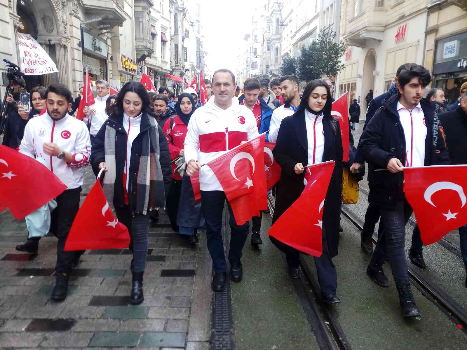 Beyoğlu’nda İstiklal Marşı’nın kabulünün 101’inci yıl dönümünde milli sporcular ile gençler hep birlikte İstiklal Marşı’nı okudu.