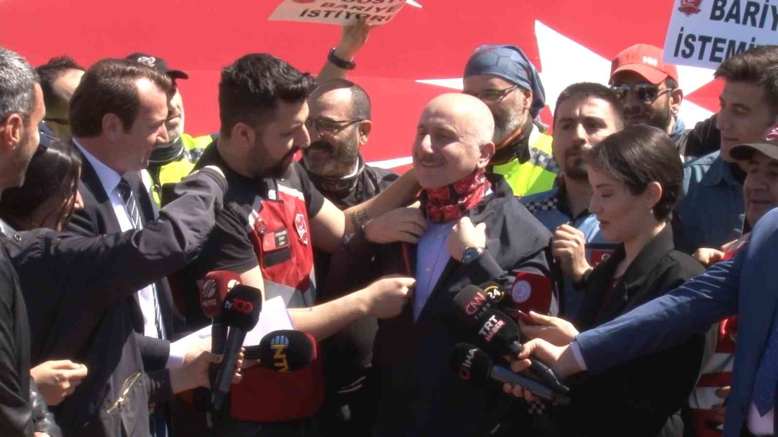 Konuşması sonrası Bakan Karaismailoğlu motosiklet sürücülerinin kullandığı bafftan taktı.