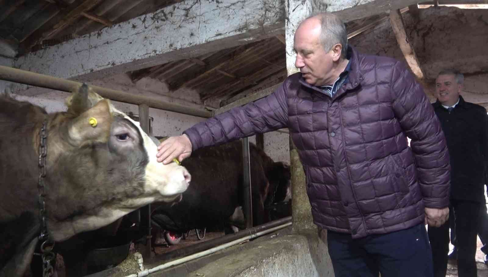 İnce, memleketi Yalova’da gazetecilerle bir araya geldi. Merkeze bağlı Safran köyündeki bir besi çiftliğinde ahırda gerçekleşen basın toplantısında, büyükbaş hayvanları arkasına alan İnce, saman balyalarını da koltuk ve sehpa olarak kullandı.