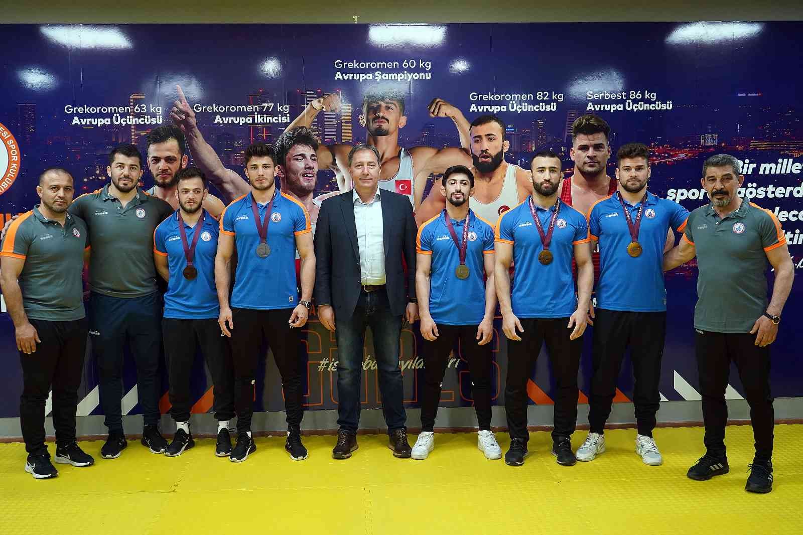 Macaristan’ın Başkenti Budapeşte’de düzenlenen Avrupa Güreş Şampiyonası’nda altın madalya kazanan Kemal Kamal, gümüş madalya kazanan Yunus Emre Başar ile bronz madalya kazanan Burhan Akbudak, Ahmet Uyar ve Osman Göçen, İBB Spor Kulübü Başkanı Fatih Keleş ile bir araya geldi. Sporcular hedeflerini aktarırken Keleş de tebriklerini iletti.