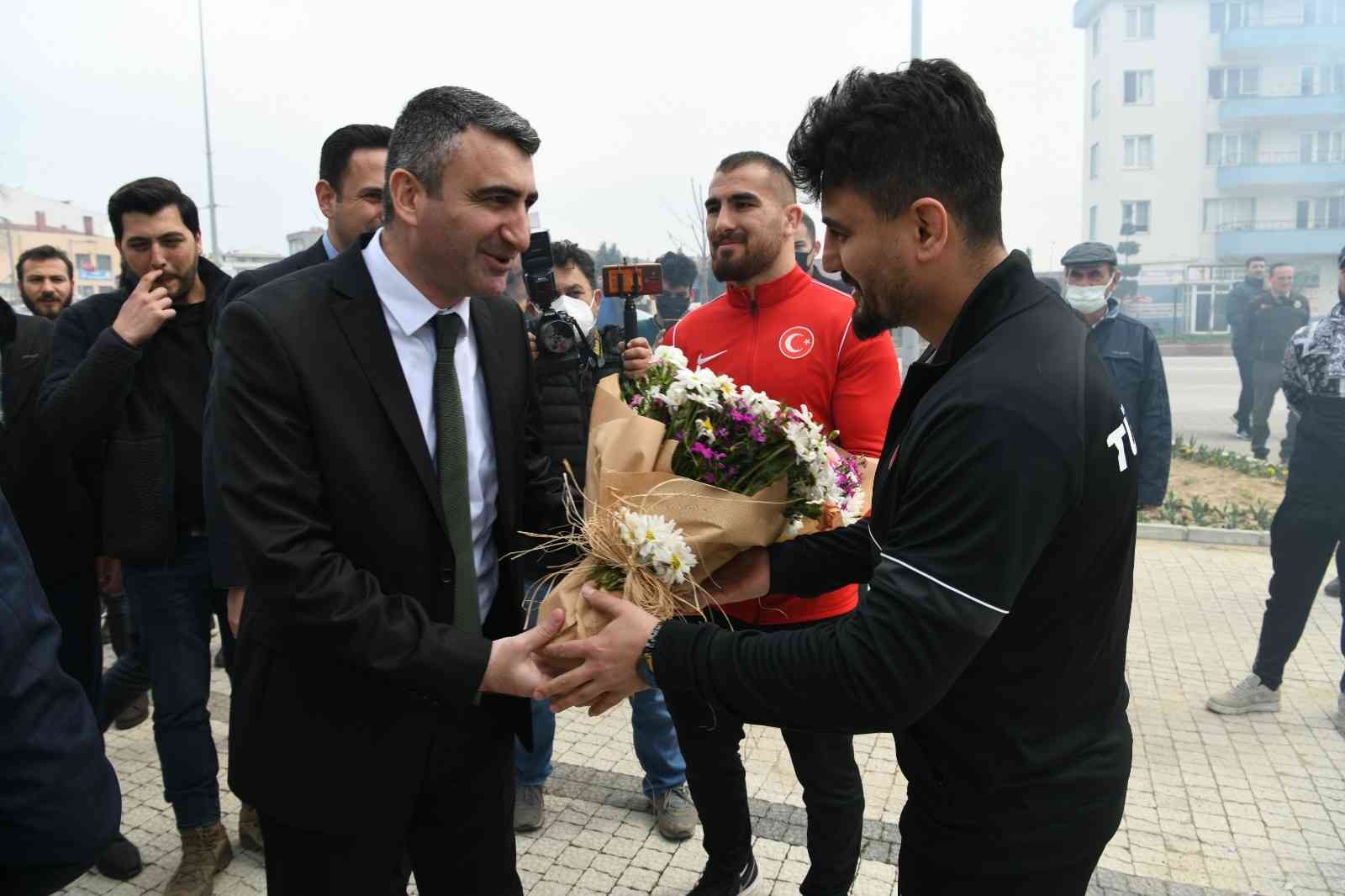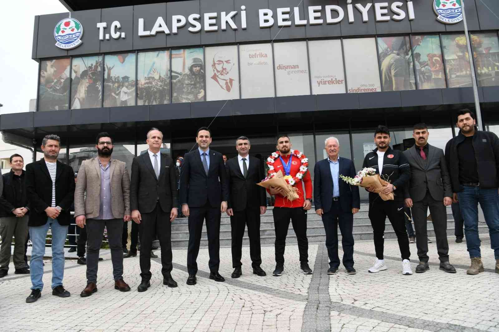 İkinci kez Avrupa Şampiyonu olan Milli Güreşçi Feyzullah Aktürk için Lapseki Belediyesi önünde tören düzenlendi.