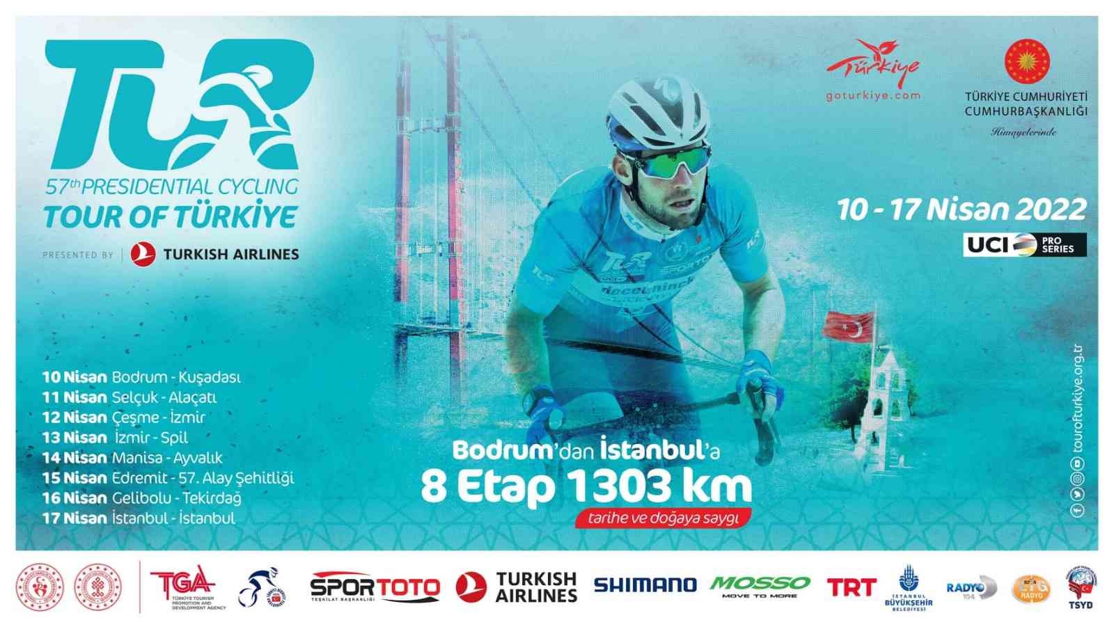 ’Tarihe, Doğaya Saygı’ temasıyla, T.C. Cumhurbaşkanlığı’nın himayelerinde Türkiye Bisiklet Federasyonu tarafından düzenlenecek 57. Cumhurbaşkanlığı Türkiye Bisiklet turu için geri sayım başladı. 10-17 Nisan 2022 tarihleri arasında gerçekleştirilecek ve Bodrum’dan İstanbul’a 1303 km sürecek dev organizasyon, dünya bisiklet camiasında bir ilke imza atıyor.