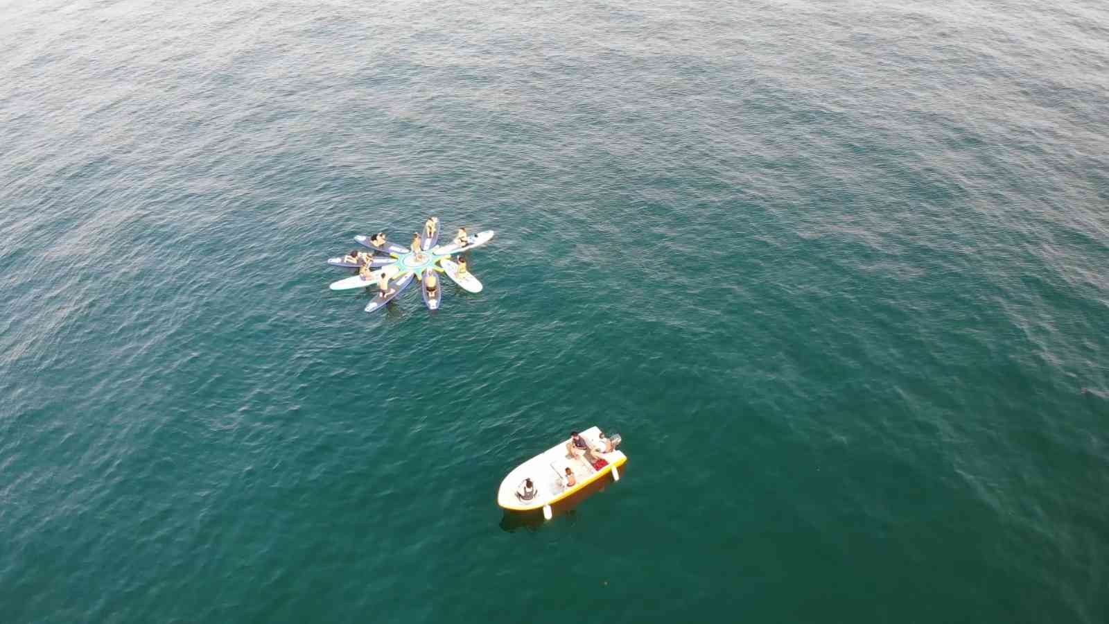 Board üzerinde yoga yaparak dalgaların etkisine rağmen dengede durmakta zorluk çeken vatandaşlar renkli görüntülere sahne oldu. Gün batımına karşı suda yapılan yoga havadan görüntülendi.