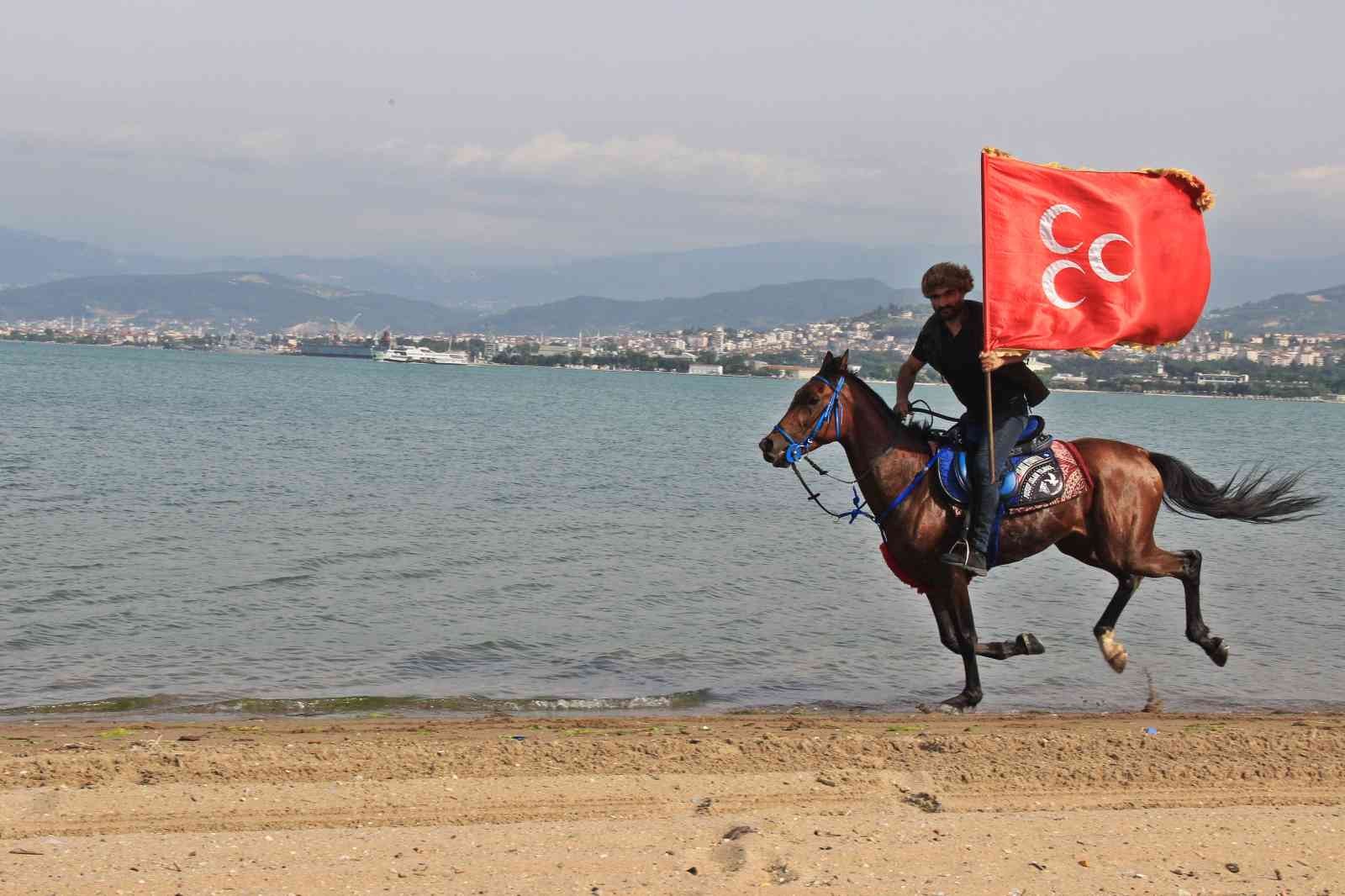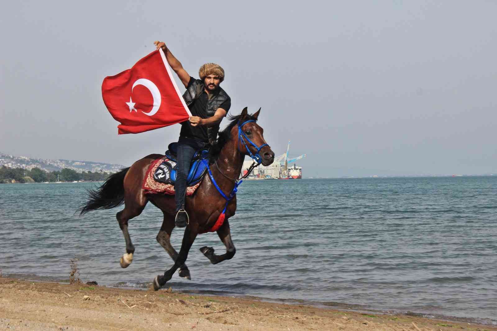 İkili, dükkandaki işlerin yoğun olmadığı zamanları da Tütünçiftlik sahilinde değerlendiriyor. Başında börkü, yanındaki 3 hilal, Göktürk, Azerbaycan ve Türk bayraklarıyla sahile giden Yılmaz, atın üzerinde bayrakları gururla dalgalandırıyor. Görenlerin dikkatini çeken ikili, herkes tarafından seviliyor.