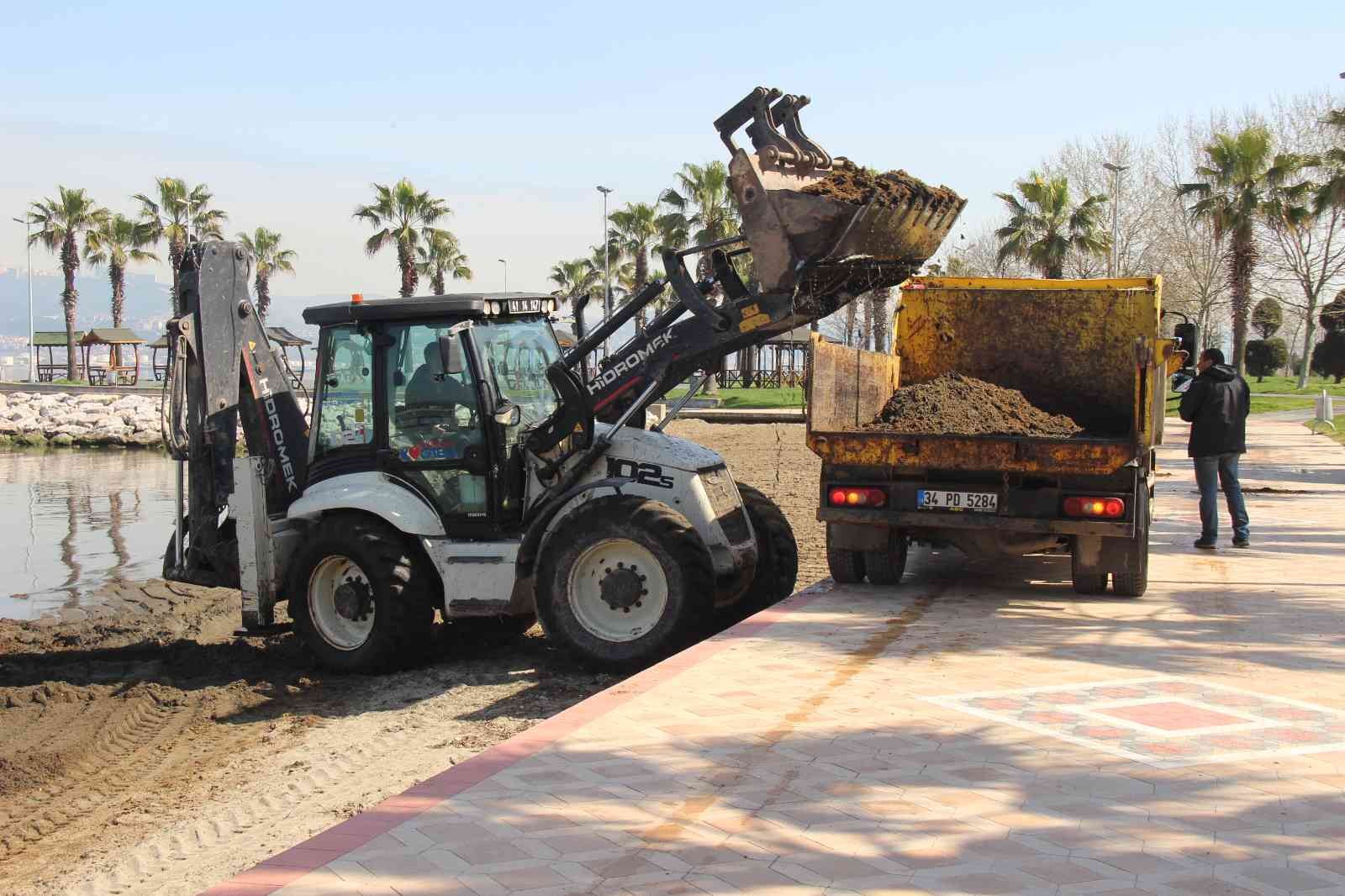 İş makinesiyle sahile giren ekipler, kepçe yardımıyla hayvan pisliğini kamyon kasasına doldurdu.
