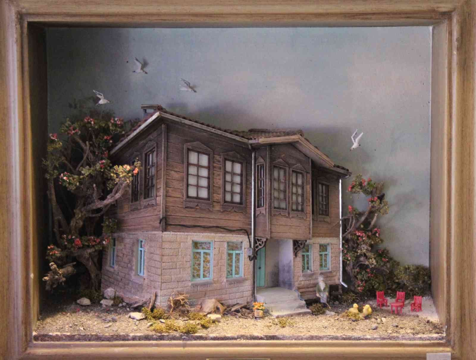 Rölyef tekniğiyle üç boyutlu tablolar yapan Mehmet Erol Buga, aynı zamanda kartondan ve ahşap malzemelerden birbirinden güzel minyatür evler yapıyor.
