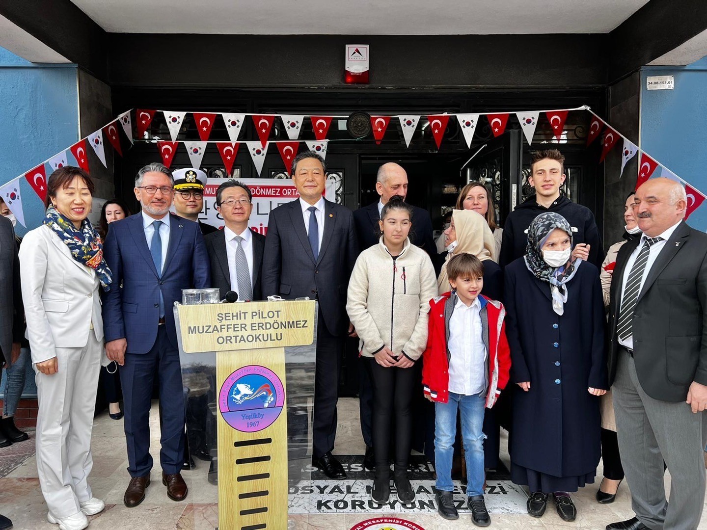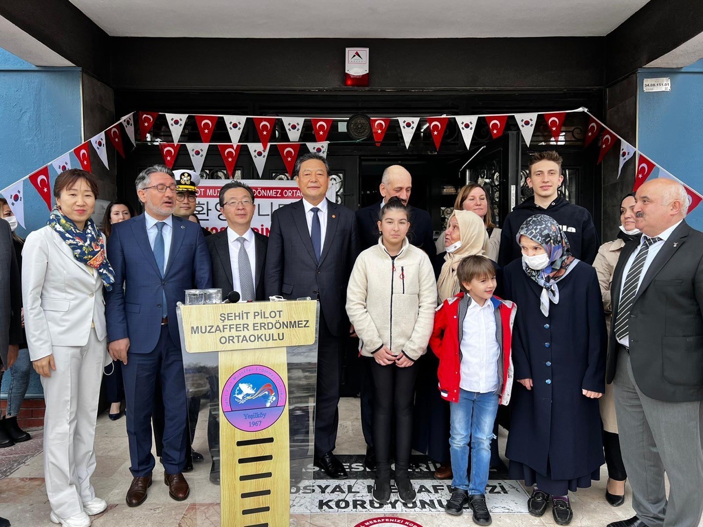 Kore Cumhuriyeti Gaziler Ve Vatanseverler Bakani Hwang Ki Chul yaptığı konuşmada, “Merhaba, 1 Nisan bugün Üsteğmen Muzaffer Erdönmez’in Kore Savaşı’nda kahraman ilan edildiği önemli bir gündür. Böylesi bir günde şehidin adının verildiği Muzaffer Erdönmez Ortaokulu öğrencilerinin karşısında bulunmaktan ötürü büyük mutluluk duyuyorum. Şehit Muzaffer Erdönmez, Kore Savaşı’nda Kuzey Kore’de bombalama görevleri gerçekleştiren B-26 uçaklarında bombardıman pilotu olarak görev yapmıştı. Şehidimiz 21 Nisan 1951 günü Kuzey Kore’nin kuzeydoğusunda bir demiryolu imha görevi sırasında bombalama görevi icra ederken, uçağı bir düşman uçaksavar füzesi tarafından isabet almış ve kendisi şehit olmuştur.