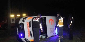 Vakaya giden ambulans virajı alamayınca yan yattı