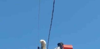 İş yerinin tabelasında mahsur kalan kediyi kurtarmak için seferber oldular