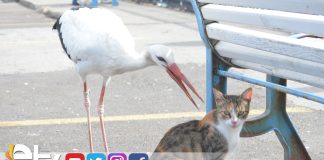 BALIK ÇALARKEN GÖRÜNTÜLENEN LEYLEK, KEDİLERE SAVAŞ AÇTI