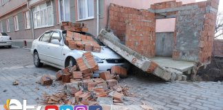ŞİDDETLİ RÜZGAR NEDENİYLE OTOMOBİLİN ÜZERİNE DUVAR YIKILDI