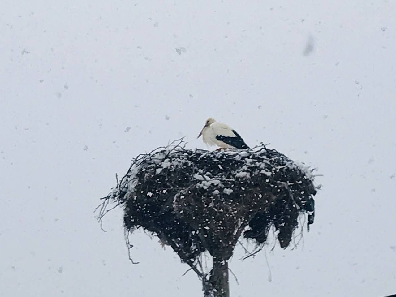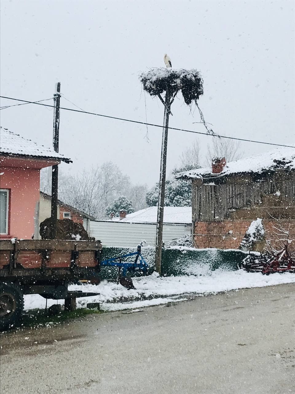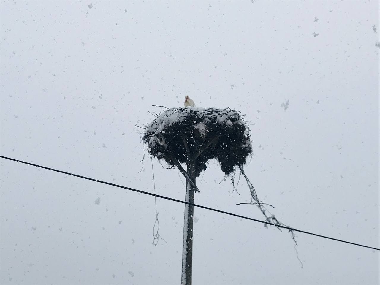 Her yıl Mart ayında köye gelen leyleğin başına bu yıl kar yağdı.
