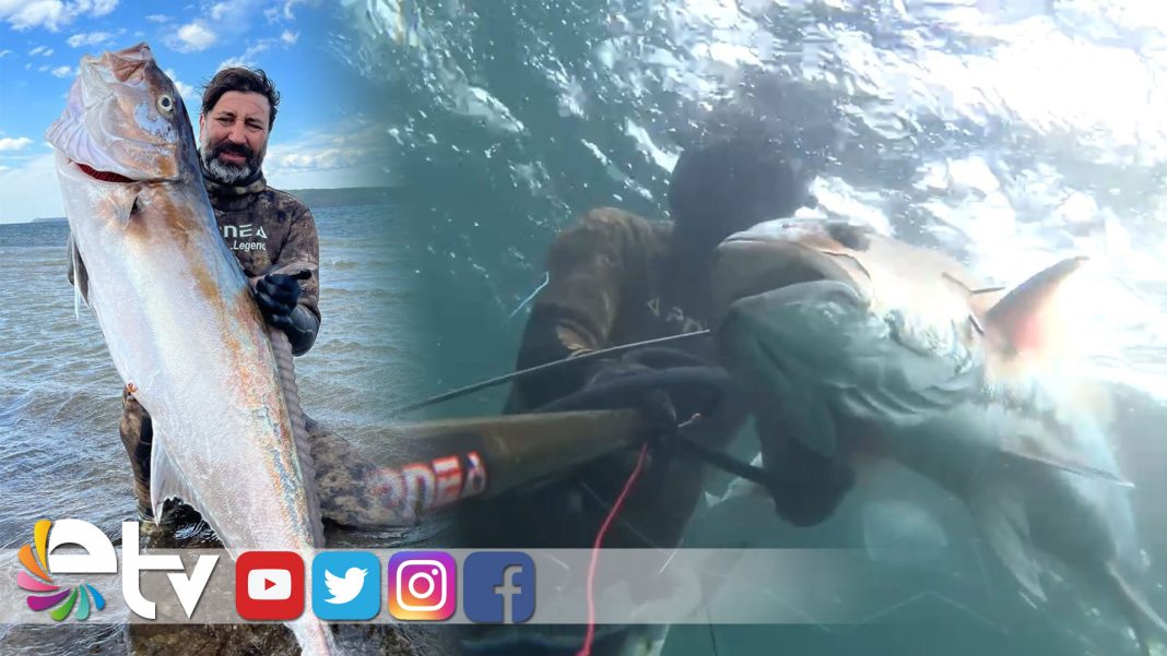 Çanakkale’de zıpkınla 20 metre derinlikte serbest dalış yapan rekortmen dalgıç Müjdat Turan, 40 kilogram ağırlığında 1 metre 70 santim boyunda akya balığı avladı. Nefes kesen av anını su altı kamerasıyla kaydeden Turan, kendisini 1 kilometre sürükleyen balıkla yaklaşık 1,5 saat mücadele etti.