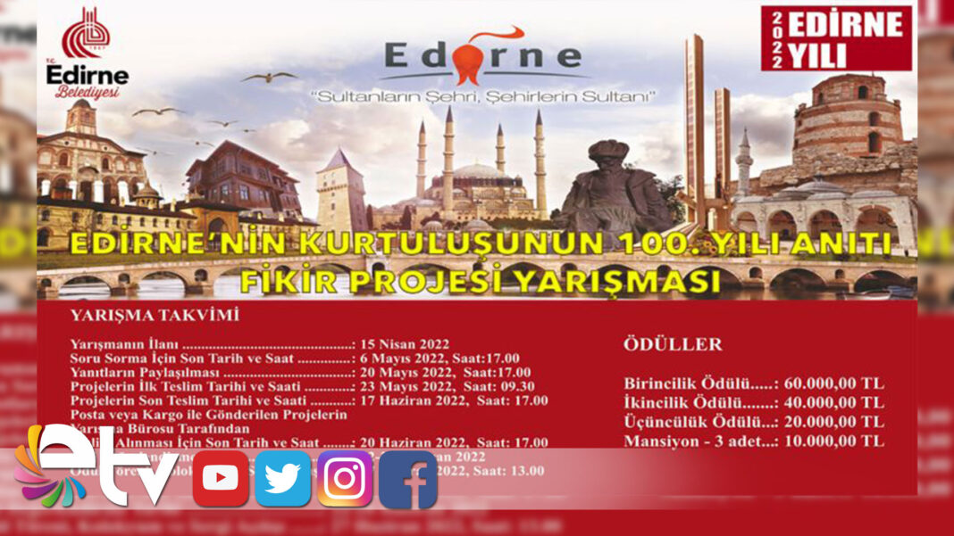 Edirne Belediyesi, 25 Kasım 1922-2022 Edirne’nin Kurtuluşunun 100. Yılı Anıtı Fikir Projesi Yarışması için http://100yilanityarismasi.edirne.bel.tr adresli internet sitesini de hizmete aldı. Yarışmaya katılmak isteyenler detaylı tüm bilgiye bu sayfadan ulaşabilecek.