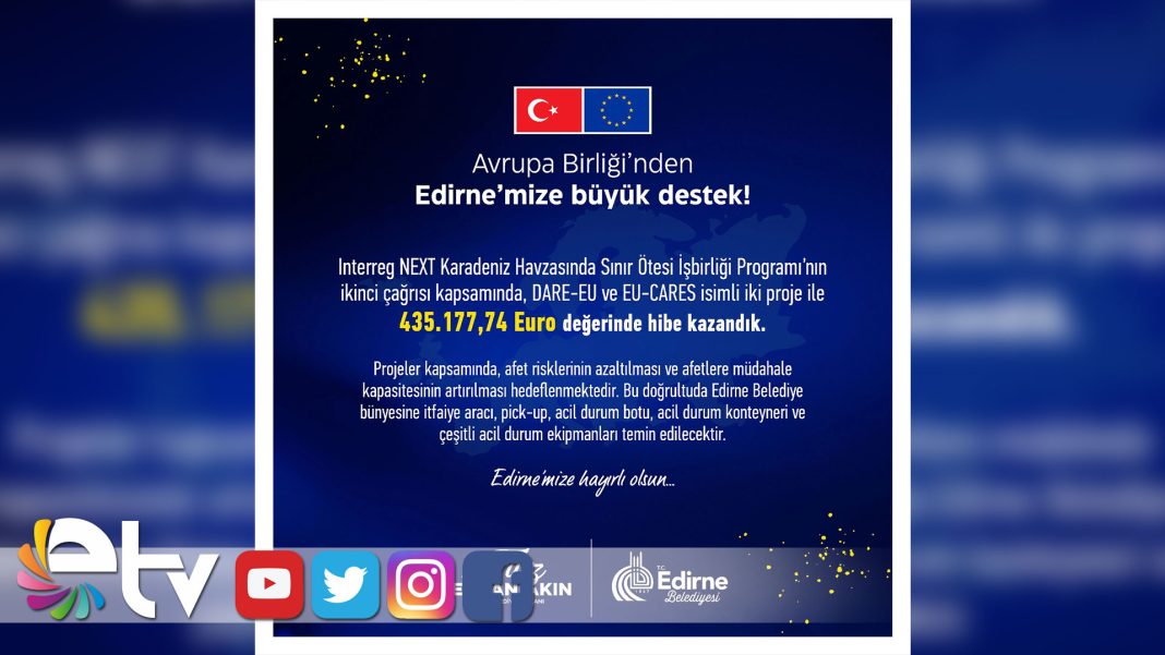 Edirne Belediyesi, Interreg NEXT Karadeniz Havzasında Sınır Ötesi İşbirliği Programı’nın ikinci çağrısı kapsamında Türkiye genelinde kabul edilen iki projesiyle hibe almaya hak kazandı. Her iki projede afet risklerinin azaltılması, afetlere müdahale kapasitesinin artırılması ve yerel yönetimlerin kurumsal olarak güçlendirilmesi hedeflendi. Bu kapsamda Edirne Belediyesi bünyesine bir itfaiye aracı, pick-up, acil yardım botu, acil durum konteyneri, jeneratörler, yangın söndürme sistemleri ve çok sayıda acil müdahale ekipmanı kazandırılacak. Bu kapsamda Edirne Belediyesi, projeleriyle toplam 435.177,74 Euro hibe almaya hak kazandı.