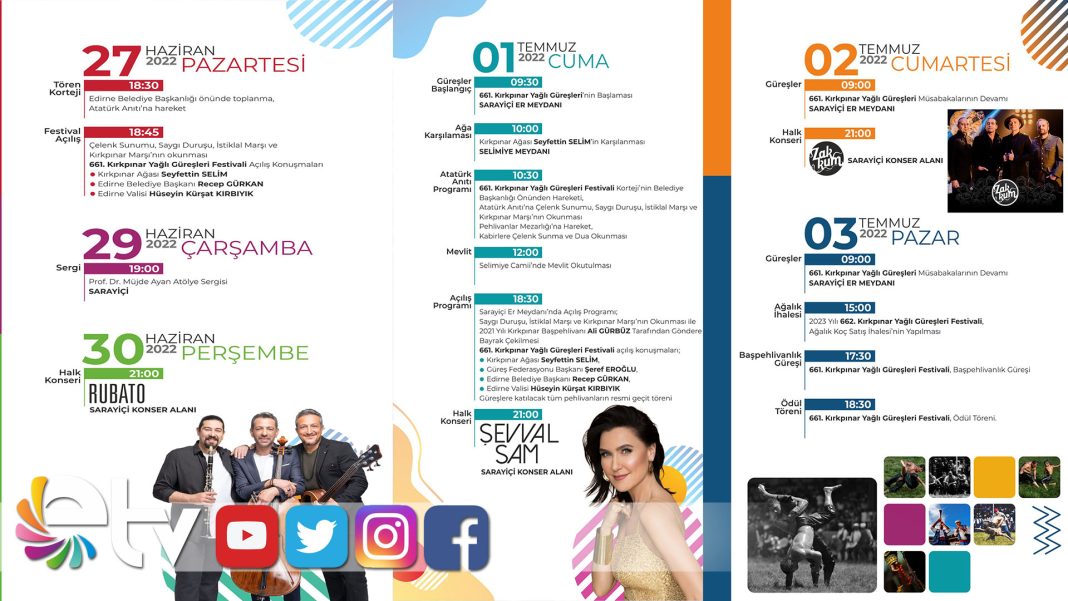 Kırkpınar Güreşleri’nin resmi açılış programı ise aynı gün saat 18.30’da Sarayiçi Er Meydanı’nda gerçekleştirilecek. Ayrıca 1 Temmuz Cuma akşamı Sarayiçi Konser Alanında, ünlü sanatçı Şevval Sam konser verecek.