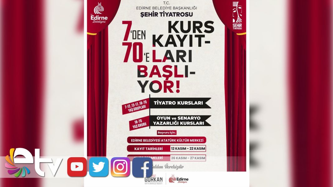 29 Ekim Özel Gösterisi ile perdelerini açan Edirne Belediyesi Şehir Tiyatrosu’nda Tiyatro Kursu ile Oyun ve Senaryo Yazarlığı kursları başlıyor. Ücretsiz olarak düzenlenecek olan kurslara 7’den 70’e tüm vatandaşlar başvuru yapabilecek.
