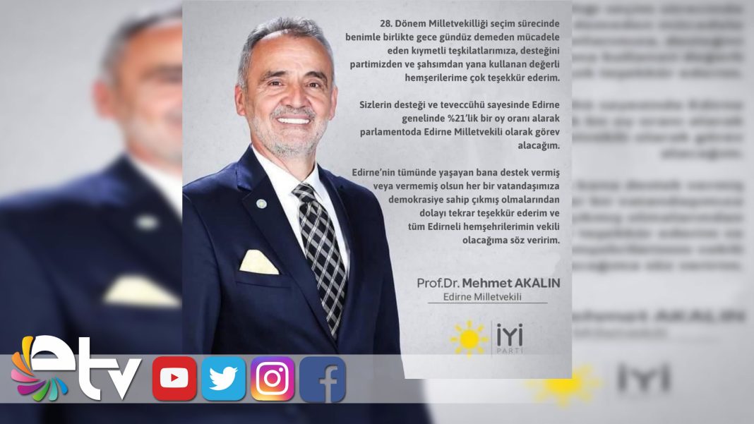 14 Mayıs’ta gerçekleşen seçimlerde İYİ Parti Edirne Milletvekili seçilen Prof. Dr. Mehmet Akalın, yayınladığı teşekkür mesajında, “Edirne’nin tümünde yaşayan bana destek vermiş veya vermemiş olsun her bir vatandaşımıza demokrasiye sahip çıkmış olmalarından dolayı teşekkür ederim ve tüm Edirneli hemşehrilerimin vekili olacağıma söz veririm.” ifadelerini kullandı.