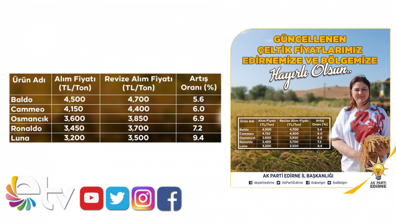 AK Parti Genel Başkanı ve Cumhurbaşkanı Recep Tayyip Erdoğan başkanlığında gerçekleşen 145’inci Genişletilmiş İl Başkanları Toplantısı’na katılan AK Parti Edirne İl Başkanı Belgin İba, çeltik üreticisine müjdeyle döndü. Cumhurbaşkanı Erdoğan’ın talimatıyla Toprak Mahsulleri Ofisi çeltik fiyatlarında ara fiyat güncellemesi yaptı.