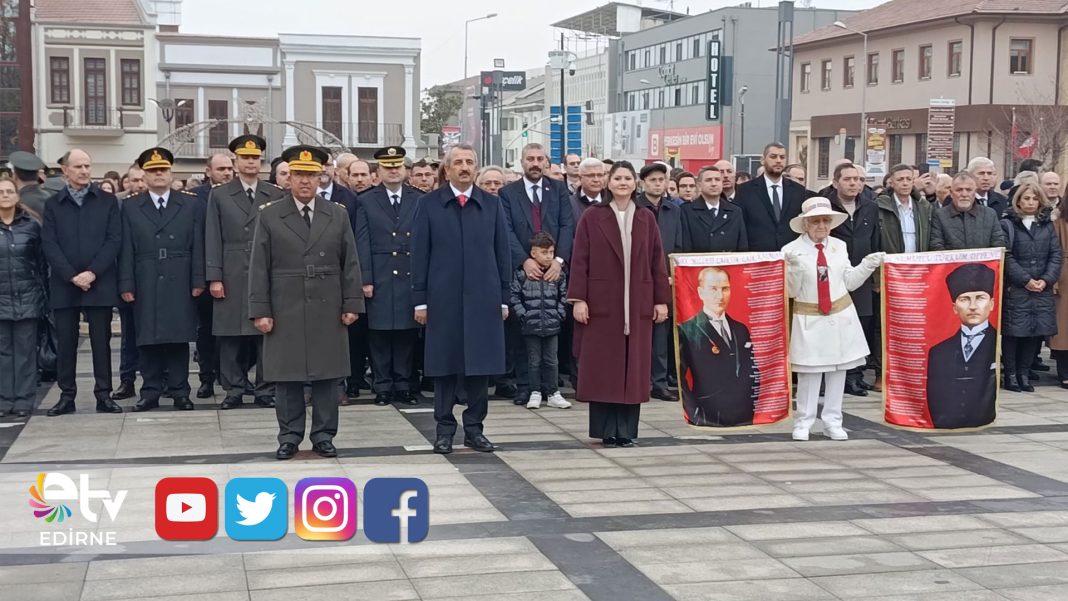 Edirne Valisi Yunus Sezer, Edirne Belediye Başkanı Filiz Gencan ve 54. Mekanize Piyade Tugay Komutanı Tuğgeneral Yüksel Kolcu’nun, Atatürk Anıtı’na çelenk sunmasının ardından, saygı duruşu ve İstiklal Marşı’nın okunmasıyla devam etti.
