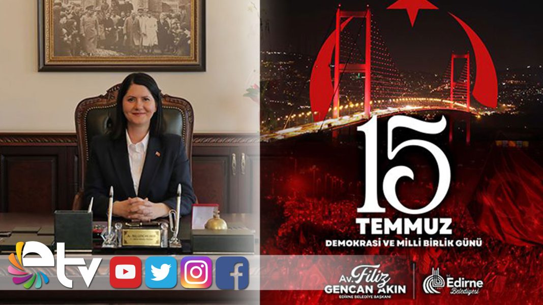 Edirne Belediye Başkanı Av. Filiz Gencan Akın, 15 Temmuz Demokrasi ve Milli Birlik Günü nedeniyle yayınladığı kutlama mesajında, “O gece, kadın erkek, genç yaşlı demeden meydanlara akın eden, tankların önüne yatan, kurşunlara siper olan kahramanlarımız sayesinde ülkemiz karanlıktan aydınlığa kavuştu.” dedi.