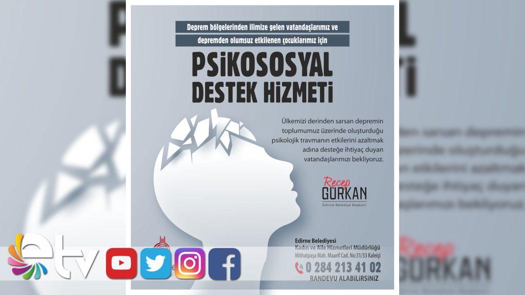 Edirne Belediyesi, deprem bölgesinden Edirne’ye gelen depremzedeler için psikososyal destek hizmeti verileceğini duyurdu.