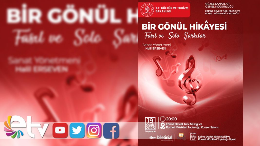 Kültür ve Turizm Bakanlığı Güzel Sanatlar Genel Müdürlüğü Edirne Devlet Türk Müziği ve Rumeli Müzikleri Topluluğu tarafından ‘Bir Gönül Hikayesi’ adlı konser düzenlenecek. Konser; 19 Ocak Perşembe günü saat 20.00’da Edirne Devlet Türk Müziği ve Rumeli Müzikleri Topluluğu konser salonunda gerçekleşecek.