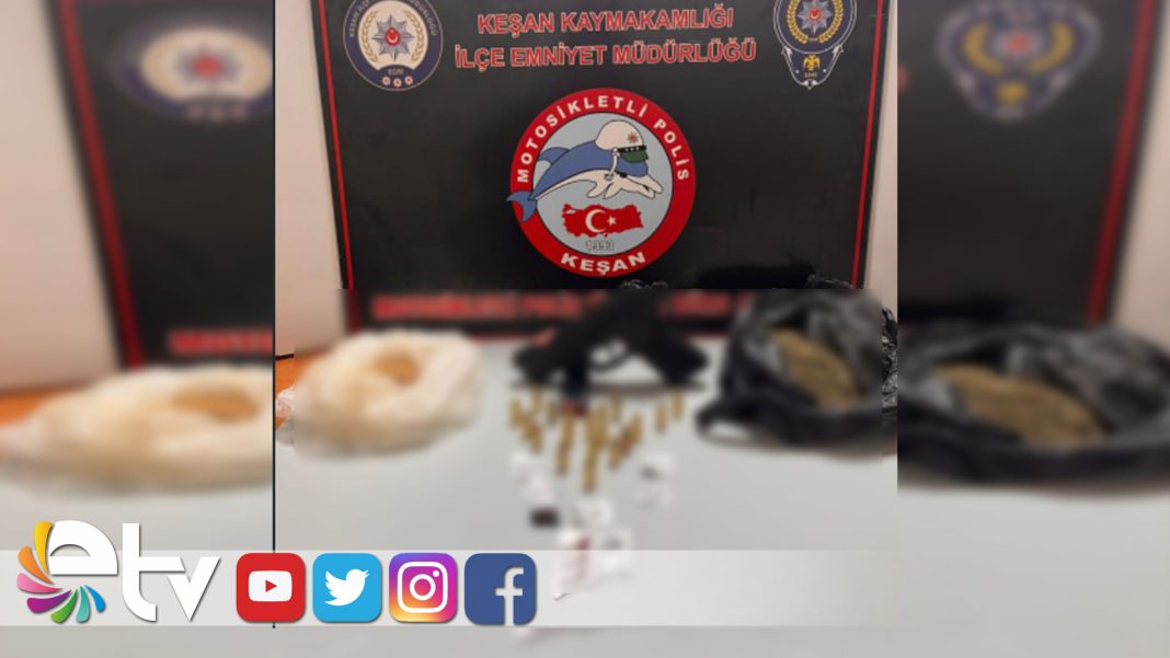 Edirne’nin Keşan ilçesinde polis ekipleri tarafından şüpheli bir şahsın üzerinde yapılan aramada; uyuşturucu madde ve ruhsatsız tabanca ele geçirildi. ‘Kasten öldürme’ ve ‘Kullanmak için uyuşturucu veya uyarıcı madde satın almak kabul etmek’ suçlarından arandığı belirlenen şahıs, çıkarıldığı mahkemece tutuklandı.