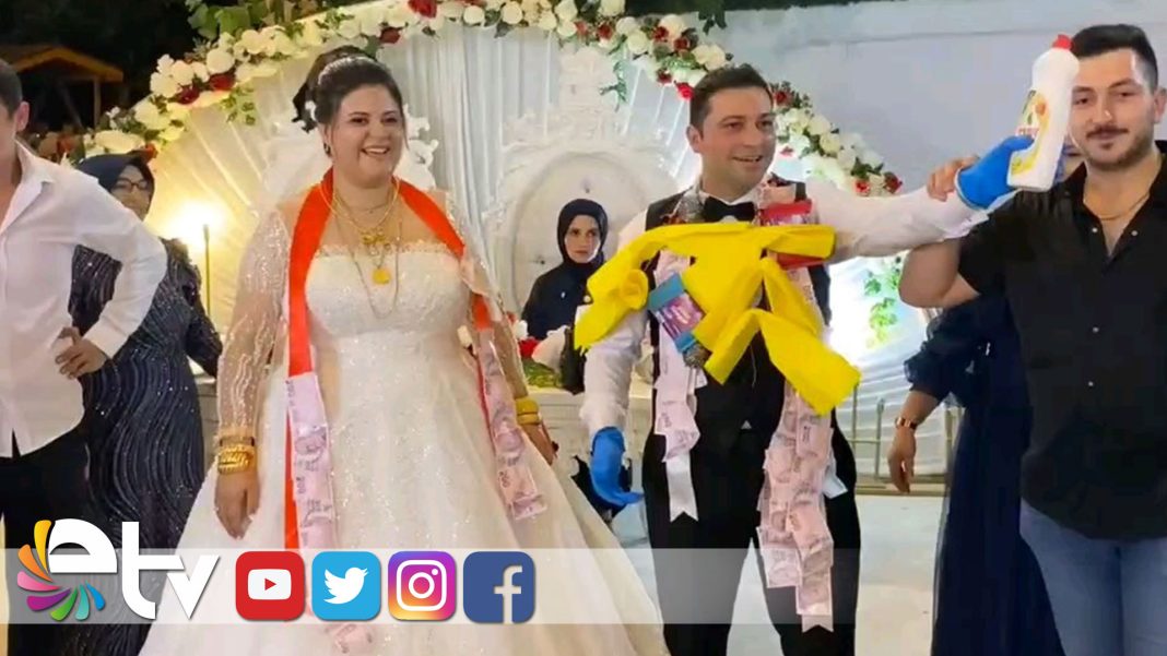 Kırklareli’nin Demirköy ilçesinde dünyaevine giren Edirneli Nergül Özaslaner ile Hakan Doğan çiftinin takı töreninde ilginç anlar yaşandı. Hayatın müşterek olduğunu belirten damadın arkadaşları, Hakan Doğan’a temizlik malzemeleri taktı.