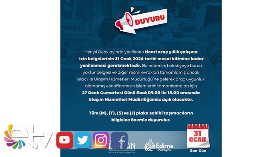 Edirne Belediyesi Ulaşım Hizmetleri Müdürlüğü, her yıl yenilenen ticari araç yıllık çalışma izin belgelerinin 31 Ocak Çarşamba günü mesai bitimine kadar yenilenmesi gerektiğini duyurdu.