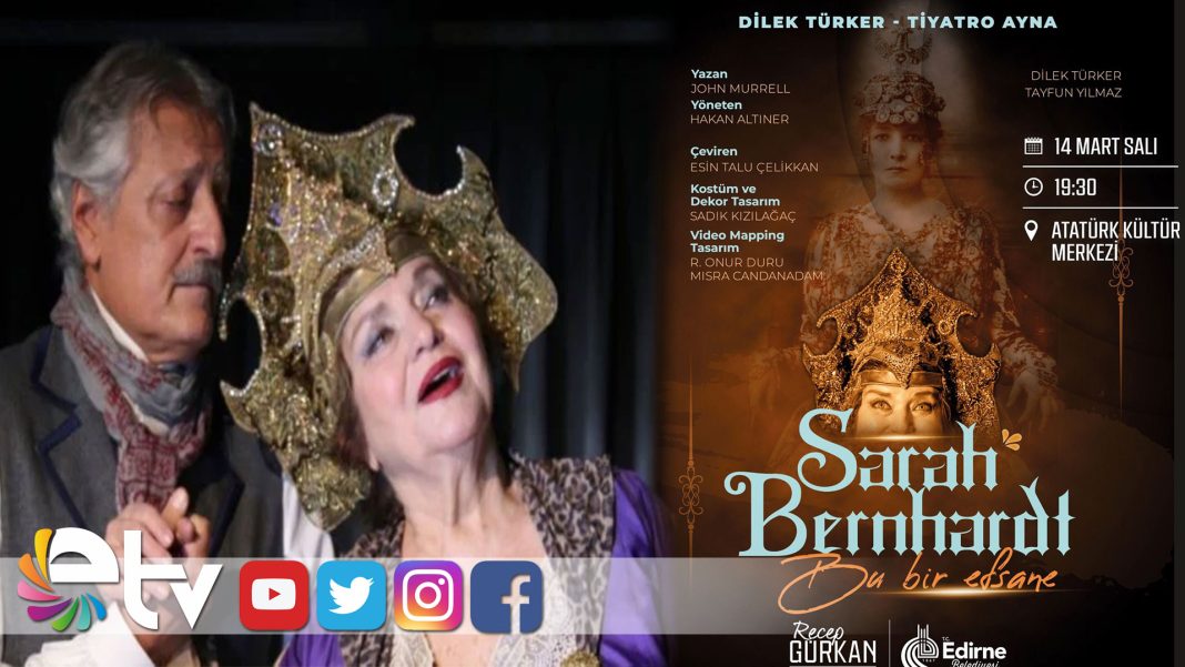 Dünyaca ünlü tiyatrocu Sarah Bernhardt’ın ölümünün 100. yılında sahnelenen “Bu Bir Efsane”Sarah Bernhardt” oyunu Edirne AKM’de, tiyatroseverler ile buluşacak. Oyundan bir gün önce ise yönetmen Hakan Altıner ile oyuncular Dilek Türker ile Tayfun Yılmaz, Edirneliler ile söyleşide bir araya gelecek.