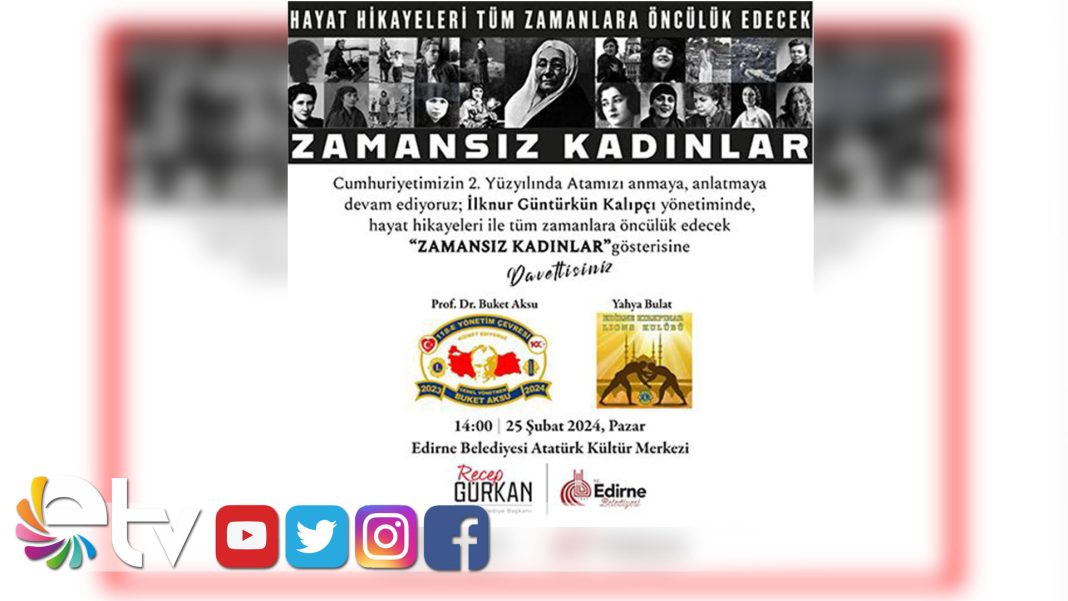 Cumhuriyetimizin 100. yılı kutlamaları kapsamında, Edirne Kırkpınar Lions Kulübü işbirliğiyle unutulmaz bir tiyatral gösteri olan “Zamansız Kadınlar” Edirnelilerle buluşacak. Bu etkileyici gösteri Edirne Belediyesi Atatürk Kültür Merkezi ve Belediye Konservatuvarı’nın ev sahipliğinde gerçekleşecek.