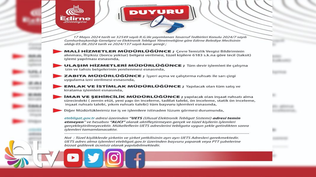 Bu yeni uygulama ile birlikte, çeşitli belediye hizmet ve işlemlerinin Ulusal Elektronik Tebligat Sistemi (UETS) üzerinden gerçekleştirileceğini belirten Edirne Belediyesi Mali Hizmetler Müdürlüğü yetkilileri yaptıkları açıklamada şunlara yer verdi: