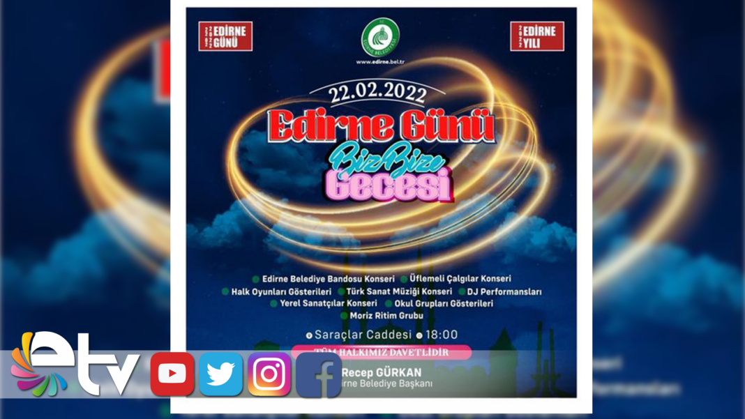 Edirne Belediye Bandosu Konseri, Üflemeli Çalgılar Konseri, Halk Oyunları Gösterileri, Türk Sanat Müziği Konseri, DJ Performansları, Yerel Sanatçılar Konseri, Okul Grup Gösterilerinin yer alacağı geceyle Edirneliler, 2022 Edirne Yılı’nda 22.02.2022 Edirne Günü’nü coşkuyla kutlayacak.