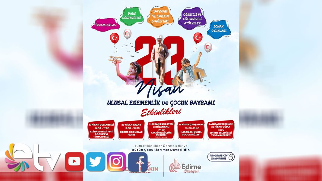 Edirne Belediyesi, 23 Nisan Ulusal Egemenlik ve Çocuk Bayramı’nı unutulmaz bir programla kutlamaya hazırlanıyor. 19-25 Nisan tarihleri arasında düzenlenecek etkinliklerde; konserlerden tiyatroya, atölye çalışmalarından sokak oyunlarına kadar birçok renkli etkinlik çocukları bekliyor.