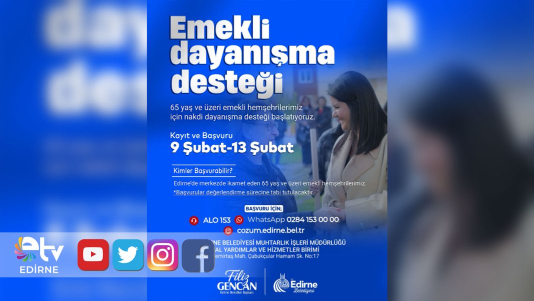 Edirne Belediyesi, 65 yaş ve üzeri emeklilere yönelik “Emekli Dayanışma Desteği” kapsamında nakdi destek başvurularını başlattı.