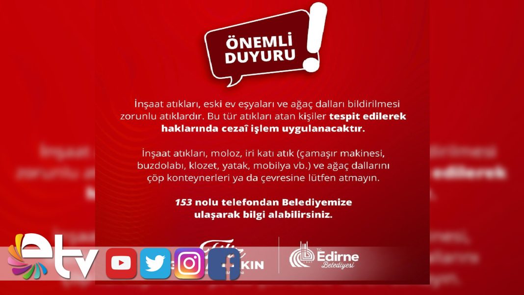 Edirne Belediyesi; inşaat atıkları, moloz, iri katı atık ve ağaç dallarının çöp konteynerlerine ya da çevrelerine atılmaması yönünde önemli bir duyuru yaptı. Söz konusu duyuruda şu ifadelere yer verildi: