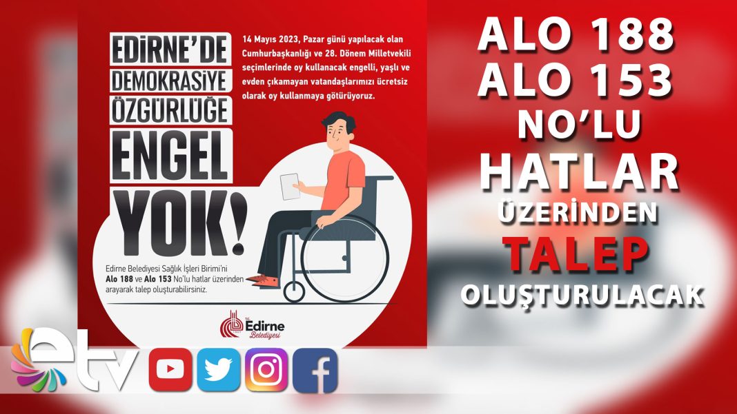 Edirne Belediyesi tarafından 14 Mayıs’ta gerçekleştirilecek olan Cumhurbaşkanlığı ve 28.Dönem Milletvekili seçimlerinde yaşlı, engelli, hasta ve sağlık durumu oy kullanmak için sandığa gitmesine engel olan vatandaşlar için ücretsiz ulaşım desteği verilecek.