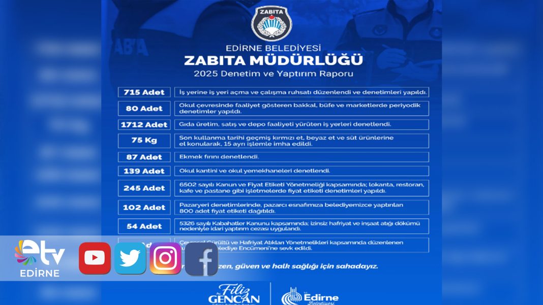 Edirne Belediyesi Zabıta Müdürlüğü, 2025 yılı boyunca kent genelinde yürüttüğü denetimlerle halk sağlığı, kamu düzeni ve tüketici haklarının korunmasına yönelik yoğun çalışma gerçekleştirdi.