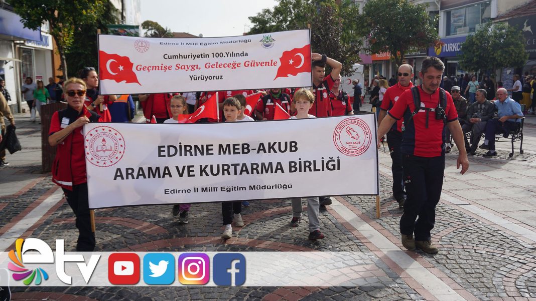 Cumhuriyetin 100’üncü yılı kutlamaları çerçevesinde Edirne’de ‘Geçmişe Saygı, Geleceğe Güvenle’ temalı etkinlik düzenlendi. İl Milli Eğitim Müdürlüğü Arama ve Kurtarma Birliği koordinasyonunda düzenlenen etkinliğe; Arama Kurtarma Birliği Ekibi, gönüllü öğretmenler, öğrenciler ve veliler katıldı. Şehitlik ziyareti ile başlayan etkinlikte, Karagöz Tabya, Aynalı Tabya, Hıdırlık Tabya ve Yıldırım Köprüsü ziyaret edildi. Daha sonra Lozan Anıtı önünde buluşan kalabalık, Jandarma Şehitliği, Tunca ve Meriç Köprüsü’nü geçerek, Saraçlar Caddesi boyunca yürüyüş yaptı. Etkinlikle ilgili açıklamada bulunan Milli Eğitim Müdürlüğü İş, Sağlık ve Güvenlik Birimi Koordinatörü Ahmet Tevfik Erdem, Cumhuriyet’in 100’üncü yılında milli mücadelenin köklü hatırasının yaşatılmasını amaçladıklarını ifade etti.