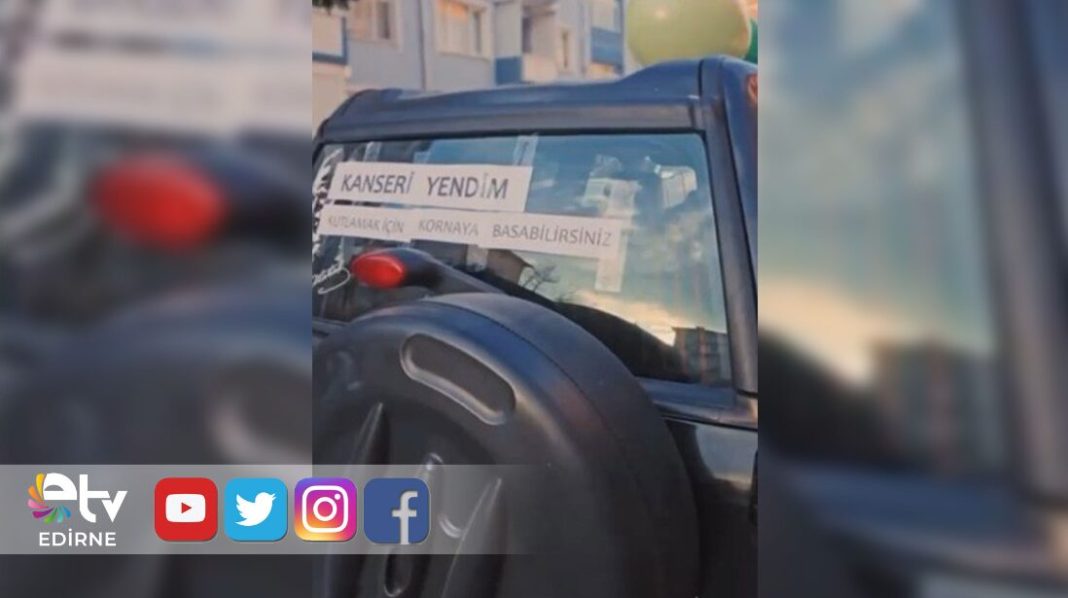 Edirne’de evliliğinin üçüncü ayında kanser teşhisi konulan genç mimar Ahmet Can’ın, tedaviyi başarıyla tamamlayarak kanseri yenmesinin ardından eşinin sürprizi üzerine aracının arkasına asılan, “Kanseri yendim, korna çalarak kutlayabilirsiniz” yazısıyla kent sokaklarında korna sesleri eşliğinde mutluluğunu paylaşırken, vatandaşlar da bu sevince eşlik etti.