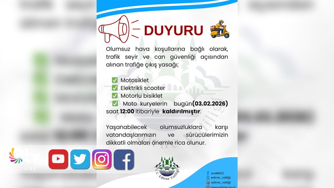 Edirne Valiliği, olumsuz hava koşulları nedeniyle trafik seyir ve can güvenliği açısından ikinci bir duyuruya kadar motosiklet, elektrikli scooter, motorlu bisiklet ve motokuryelerin trafiğe çıkışını tedbiren yasaklamıştı. Valilik tarafından yapılan yeni duyuruda, söz konusu yasağın bugün saat 12.00 itibarıyla kaldırıldığıbildirildi.