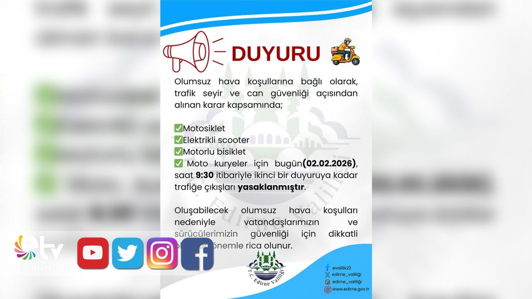 Edirne’de olumsuz hava koşulları nedeniyle motosiklet, elektrikli scooter, motorlu bisiklet ve motokuryelerin trafiğe çıkışı ikinci bir duyuruya kadar durduruldu.