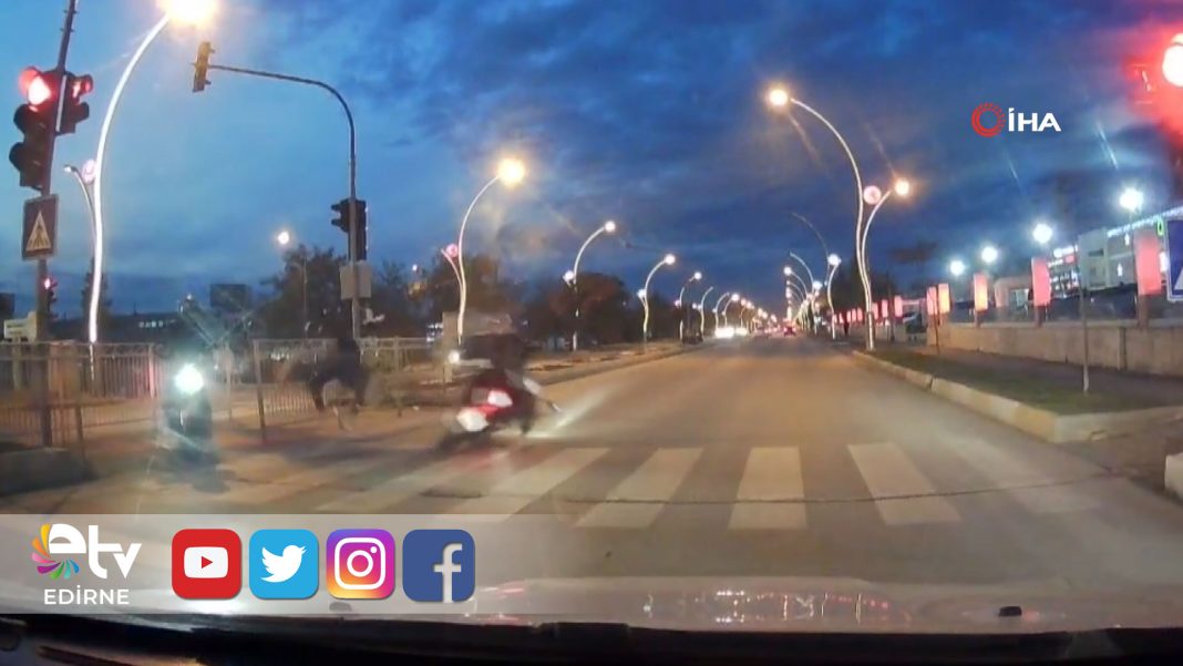 Edirne’nin Atatürk Bulvarı kavşağında kırmızı ışık ihlali yapan motosiklet, yolun karşısına geçmek isteyen yayaya çarptı. Kazada yaya ve motosiklet sürücüsü yaralanırken, kaza anı bir araç kamerasına saniye saniye yansıdı. Görüntülerde çarpmanın etkisiyle motosiklet sürücüsü ve yayanın yola savrularak sürüklendiği görüldü.